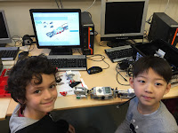 Puis, rapidement, nous avons voulu commencer nos constructions. Nous travaillons en binôme avec nos boîtes de Lego et une notice que nous suivons sur l'écran d'un ordinateur.
